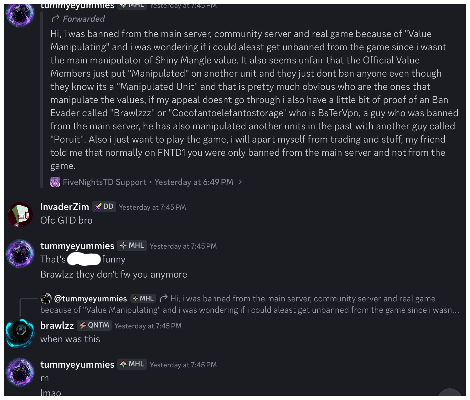 Along with Brawlzz. Who under further investigation after Falsecoy was banned, was found out to be apart of shiny jack’o manip but most importantly ban evading on a different account while trying to hide it when confronted by Jag. As he was acutally ““BsTerVpn”, being banned for other reasons.