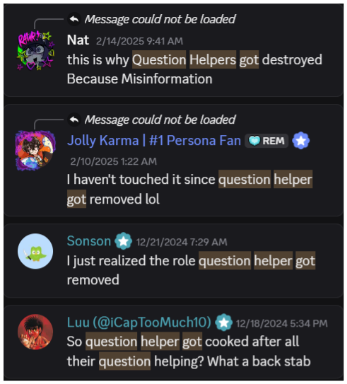 Taser’s strict enforcement escalated tensions. He harassed members, including Goon, a developer. In response, Goon, with help from admins, removed the Question Helper role entirely. Pins disappeared, and chaos returned.